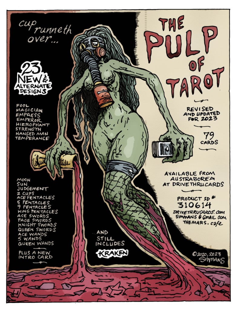 This is probably the most important feature on this blog site, because PULP TAROT is the only offering that generates revenue. Launched in 2020, and revised in 2023, the deck features 79 original designs, 21 retired designs, and 88 expansionist designs. Promos and previews will be posted below in order to pique your curiosity! Available from AustraBorea on DRIVETHRUCARDS.COM